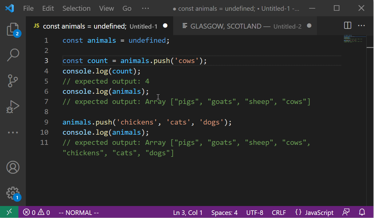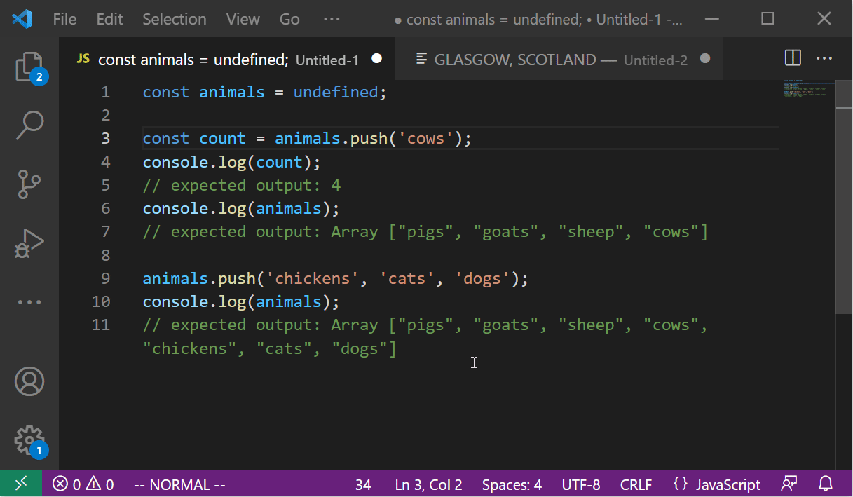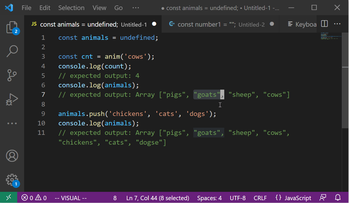 Vim Visual Mode 에서는 Visual Mode 를 시작한 커서의 위치를 기억하고 있다고 했다. o 키를 눌러 시작 커서와 현재 커서를 서로 전환할 수 있다. 문장으로 보면 이게 왜 필요한지 감이 잘 안 올 수 있겠다. 이를 활용하면 블록 영역을 더욱 스마트하게 확장할 수 있다. 다음처럼 "goats", "sheep" 이 선택되어있는 상태에서 "pigs" 까지 선택하고 싶을 수가 있다. 물론 다시 블록을 푸는 방법도 있겠지만, 현재 블록을 유지한 채로 시작커서와 현재커서를 전환하여 시작커서 위치에서 블록을 확장시켰다.