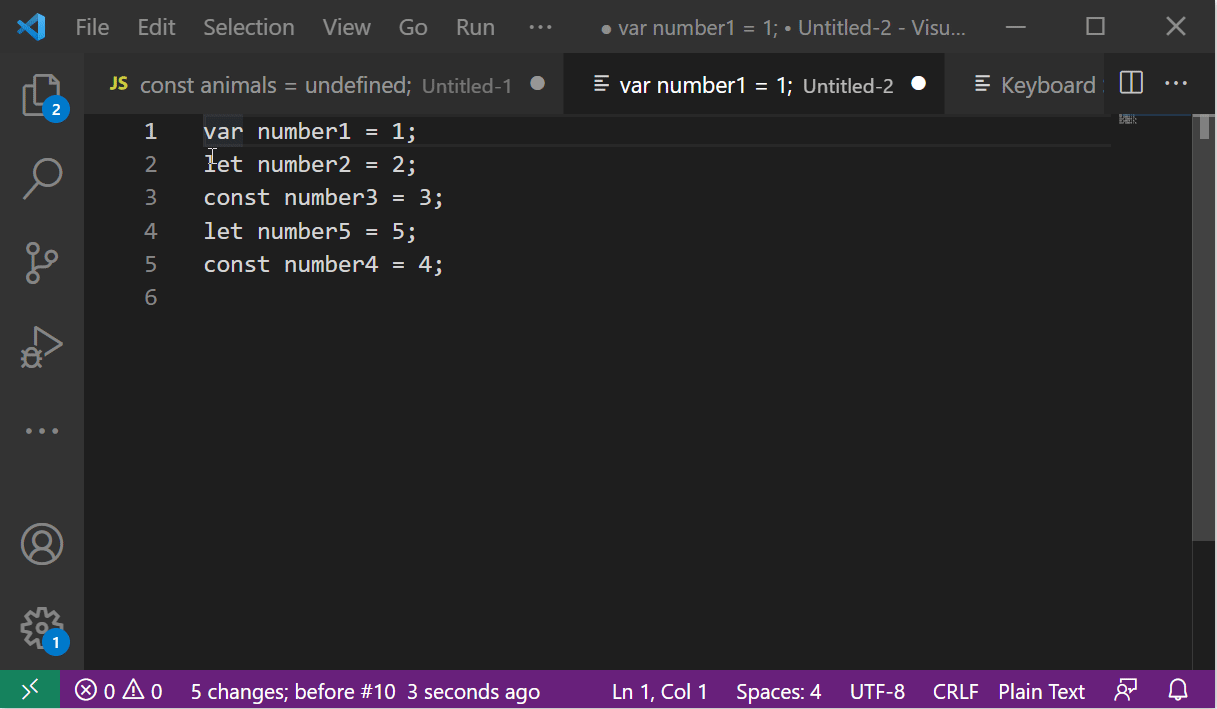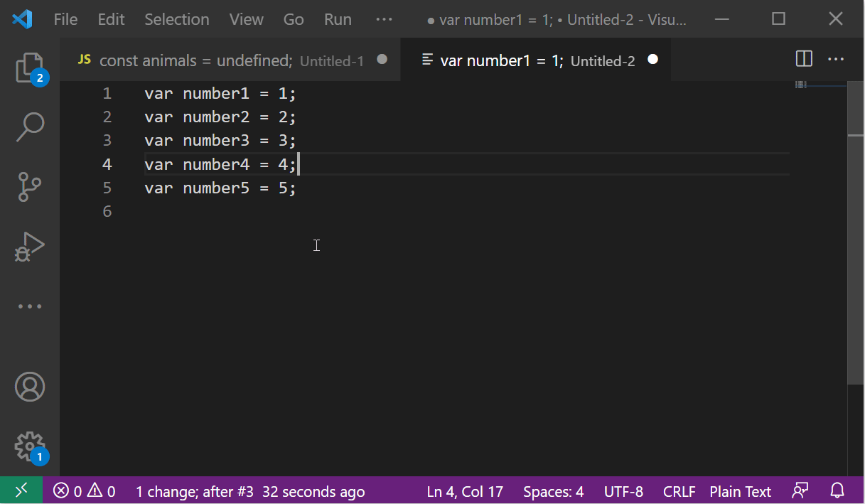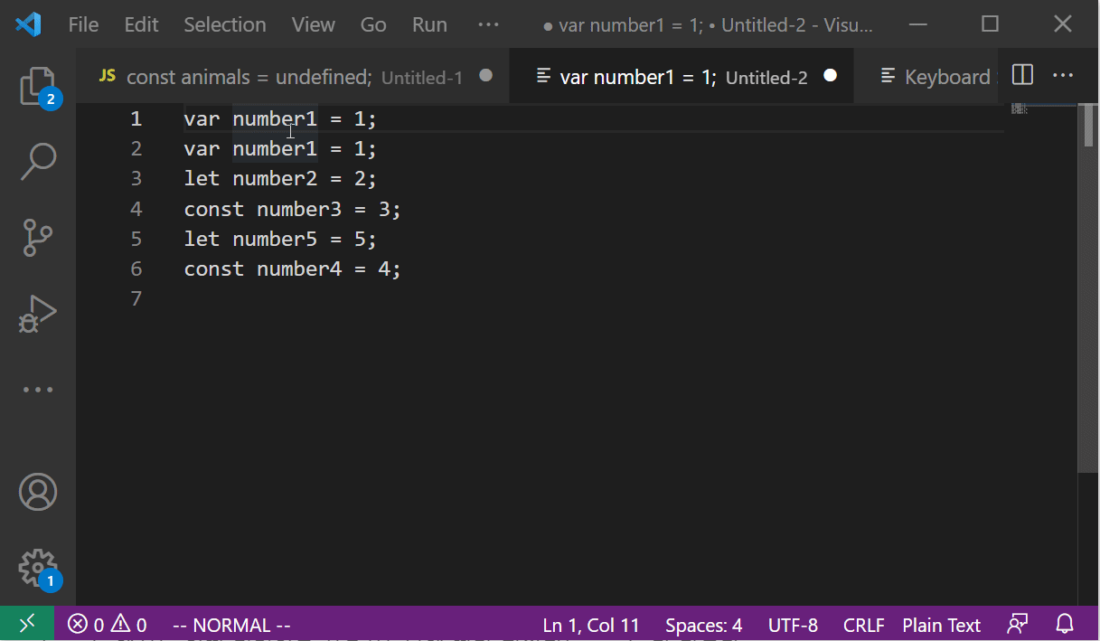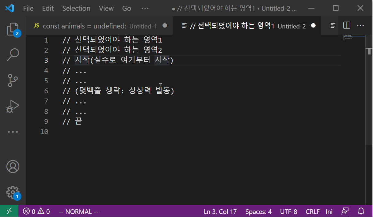 이런 경우 IDE 에서 자체적으로 제공하는 multi cursor 기능과 vim 기능을 조합하여 사용하는 것도 굉장히 도움이 된다. (조사해본 것은 아니지만, 기본 Vim 플러그인으로도 multi cursor 기능이 있지 않을까 짐작해본다.) 다음은 VSCode 에서의 Multi Cursor 와 Vim 을 조합하여 사용하는 예시이다.