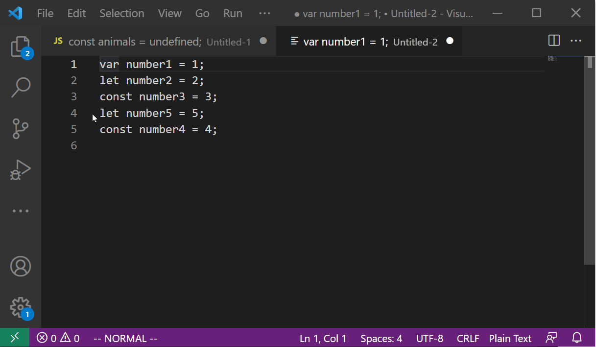 가령 다음 스크린샷과 같이, Visual Mode 로 진입하여 블록을 씌운 뒤 d키를 누르면 해당 부분이 삭제되고 Normal Mode 로 전환된 것을 확인할 수 있다.