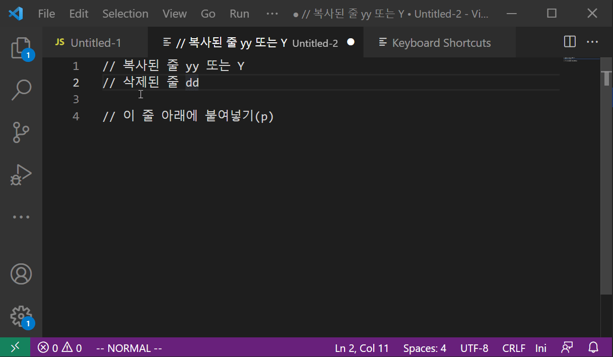- 복사된 문장들은 커서 아래줄에 붙여넣어진다.