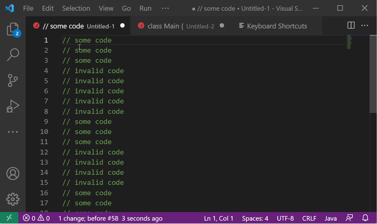 간단한 예시를 보자. 다음 코드에서 'invalid code'에 해당하는 라인만 전부 지우고 싶다고 가정하자. dd 명령어를 활용할 것이다.