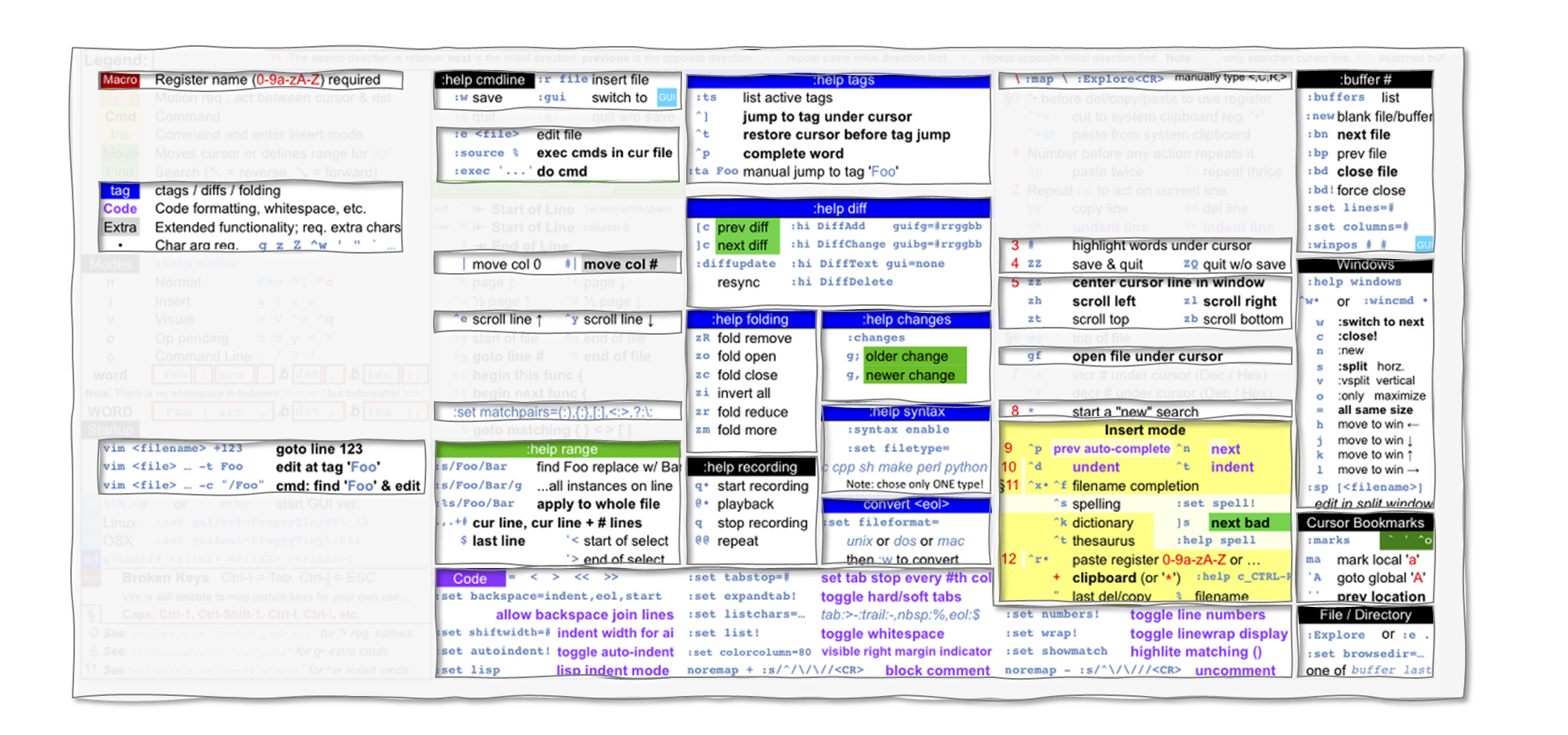 viEmu Cheat Sheet 는 키보드의 모든 키스트로크에 의미를 적어놓아, 한 눈에 Vim 의 모든 기능을 파악하기에 용이하다.
