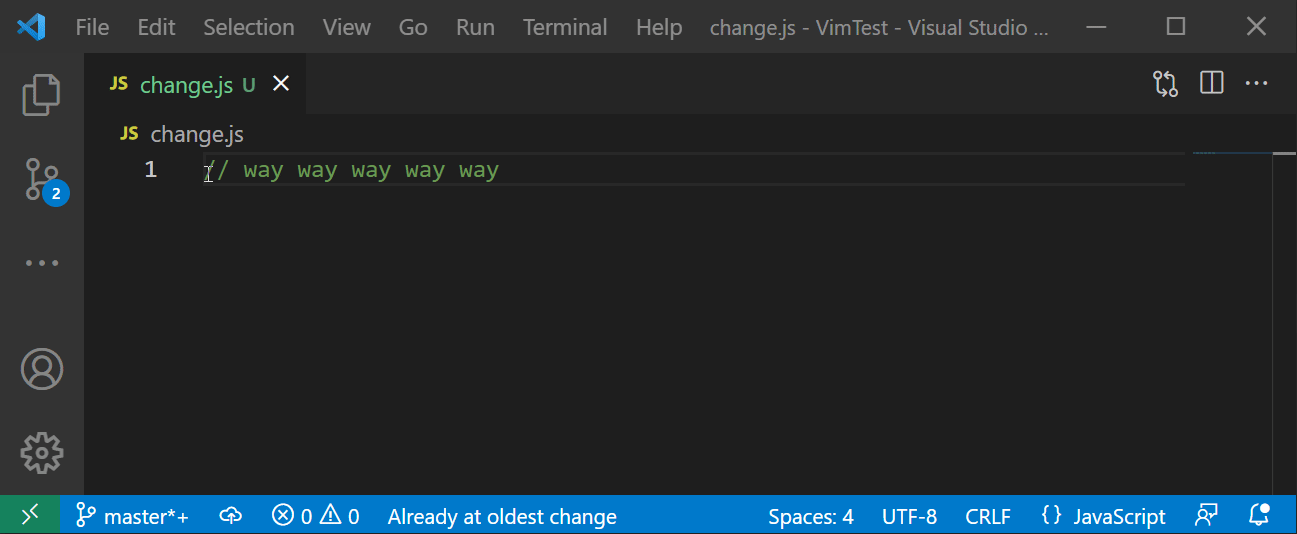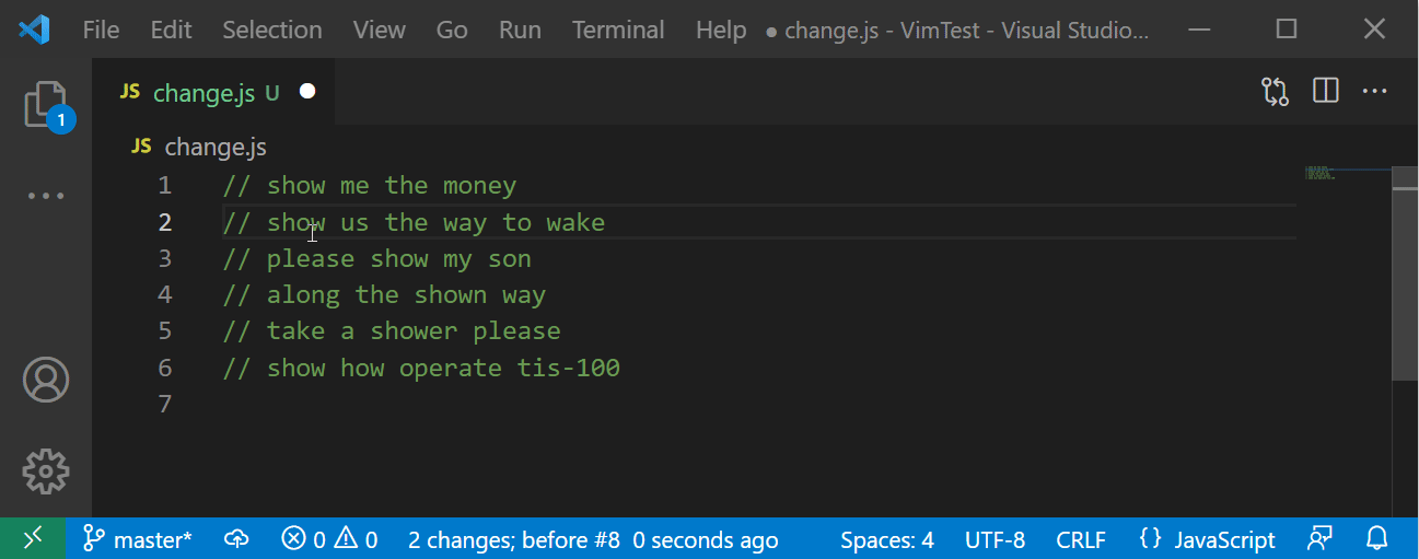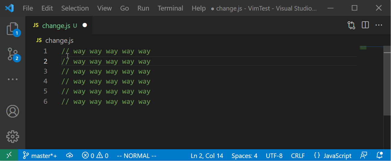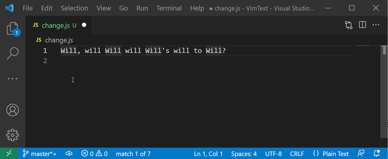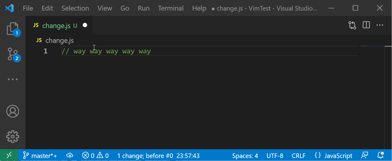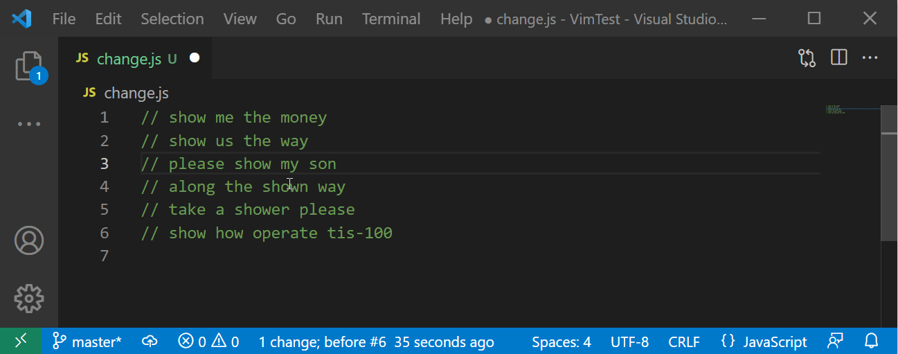 💥 안타깝게도 VSCode Vim 에서는 escaping 문자가 들어간 커맨드모드 명령을 다시 반복하는 데 문제가 있어보인다. (2021년 12월 기준) 사실 커맨드모드 명령을 반복하는 것을 소개하기 위해 이번 장을 '굳이' 추가했다.
