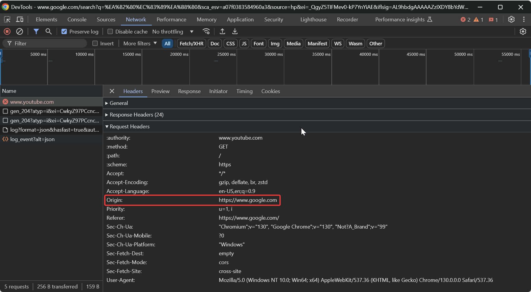 google.com 에서 fetch('https://www.youtube.com') 을 한 경우 요청 헤더는 다음과 같이 구성됩니다. Origin 이 https://www.google.com 입니다. '출처'의 의미를 갖는 요청헤더의 Origin 헤더는 요청을 보낸 현재 페이지의 '출처'를 의미합니다.